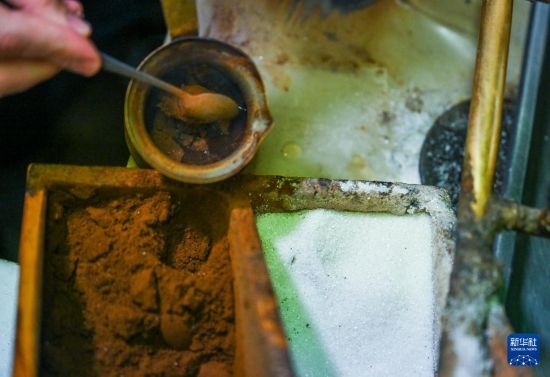 12月5日,在土耳其伊斯坦布爾一家咖啡館內,一名工作人員往器皿中添加咖啡細粉。