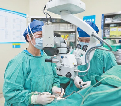 湖南省湘潭市中心醫(yī)院眼科主任謝梅芬(左)在進行人工晶體植入手術。