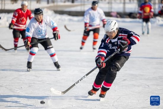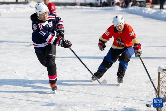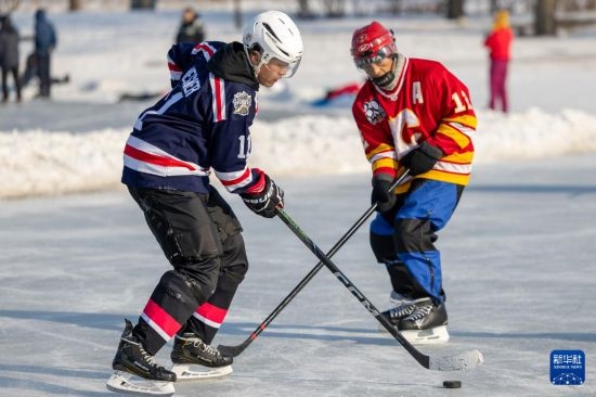 1月18日,人們?cè)诠枮I市丁香公園內(nèi)打冰球。