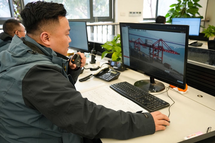 大年初一,重慶果園港集裝箱碼頭依舊繁忙。多艘集裝箱船舶??吭诖a頭,橋吊起起落落,卡車在堆場(chǎng)來回穿梭。在生產(chǎn)調(diào)度指揮中心,調(diào)度員耿杰和同事們正全神貫注地盯著屏幕,有序地調(diào)度指揮著碼頭的運(yùn)轉(zhuǎn)。