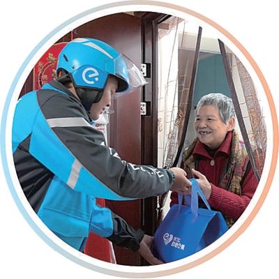 外賣騎手張魁在社區(qū)開展助老送餐服務(wù)。