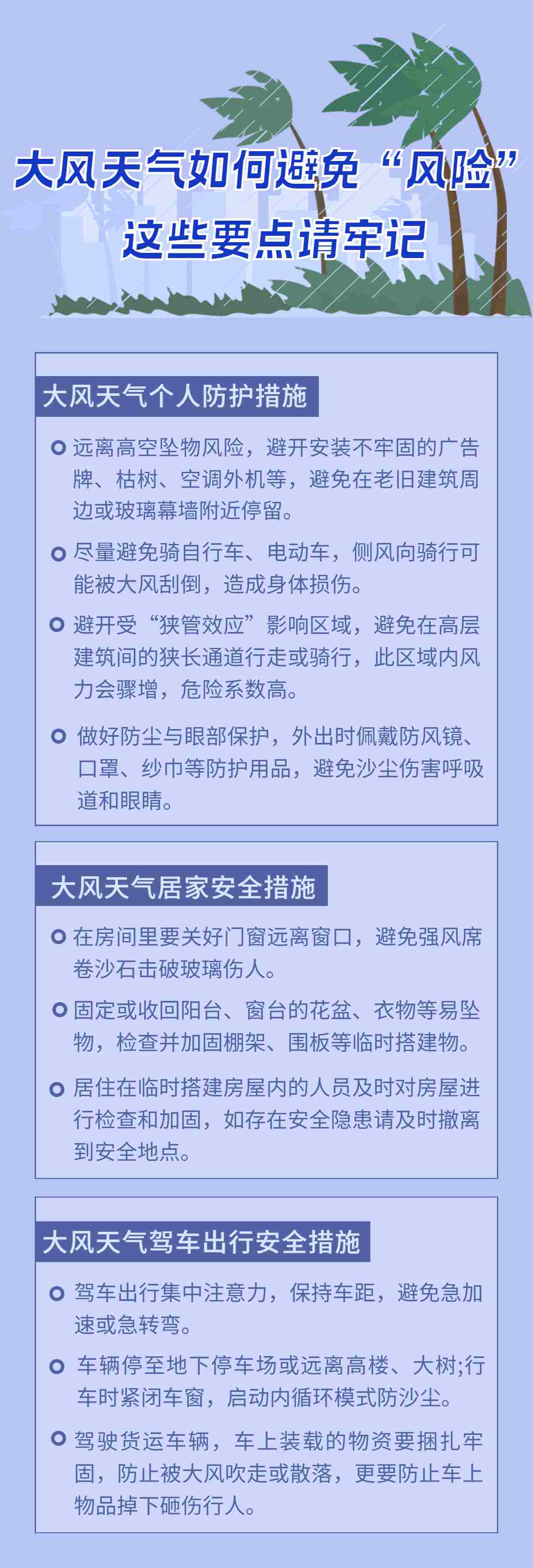 據(jù)氣象部門(mén)預(yù)報(bào),未來(lái)幾日,全國(guó)多地將出現(xiàn)強(qiáng)風(fēng)天氣,部分地區(qū)陣風(fēng)風(fēng)力可達(dá)12~13級(jí)。春季到來(lái),大風(fēng)天氣增多,給我們的生活帶來(lái)了諸多安全隱患。該如何做好防范?一起來(lái)了解。