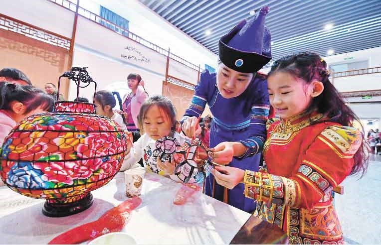 1月15日,小朋友們在非遺年貨展互動體驗(yàn)區(qū)學(xué)習(xí)制作燈籠。當(dāng)日,“非遺過大年文化進(jìn)萬家——2019年全區(qū)非物質(zhì)文化遺產(chǎn)年貨展”在內(nèi)蒙古展覽館舉辦,活動日期為1月15日至24日。本次展覽精選了與傳統(tǒng)年俗有關(guān)的近100個非遺項(xiàng)目進(jìn)行集中展示,旨在推動非物質(zhì)文化遺產(chǎn)創(chuàng)造性轉(zhuǎn)化、創(chuàng)新性發(fā)展,促進(jìn)文化脫貧攻堅(jiān),傳承和弘揚(yáng)民族優(yōu)秀傳統(tǒng)文化,將非遺融入傳統(tǒng)新春佳節(jié),讓記憶里的濃濃年味在非遺傳統(tǒng)中鮮活起來。(內(nèi)蒙古日報社融媒體記者 王磊攝)