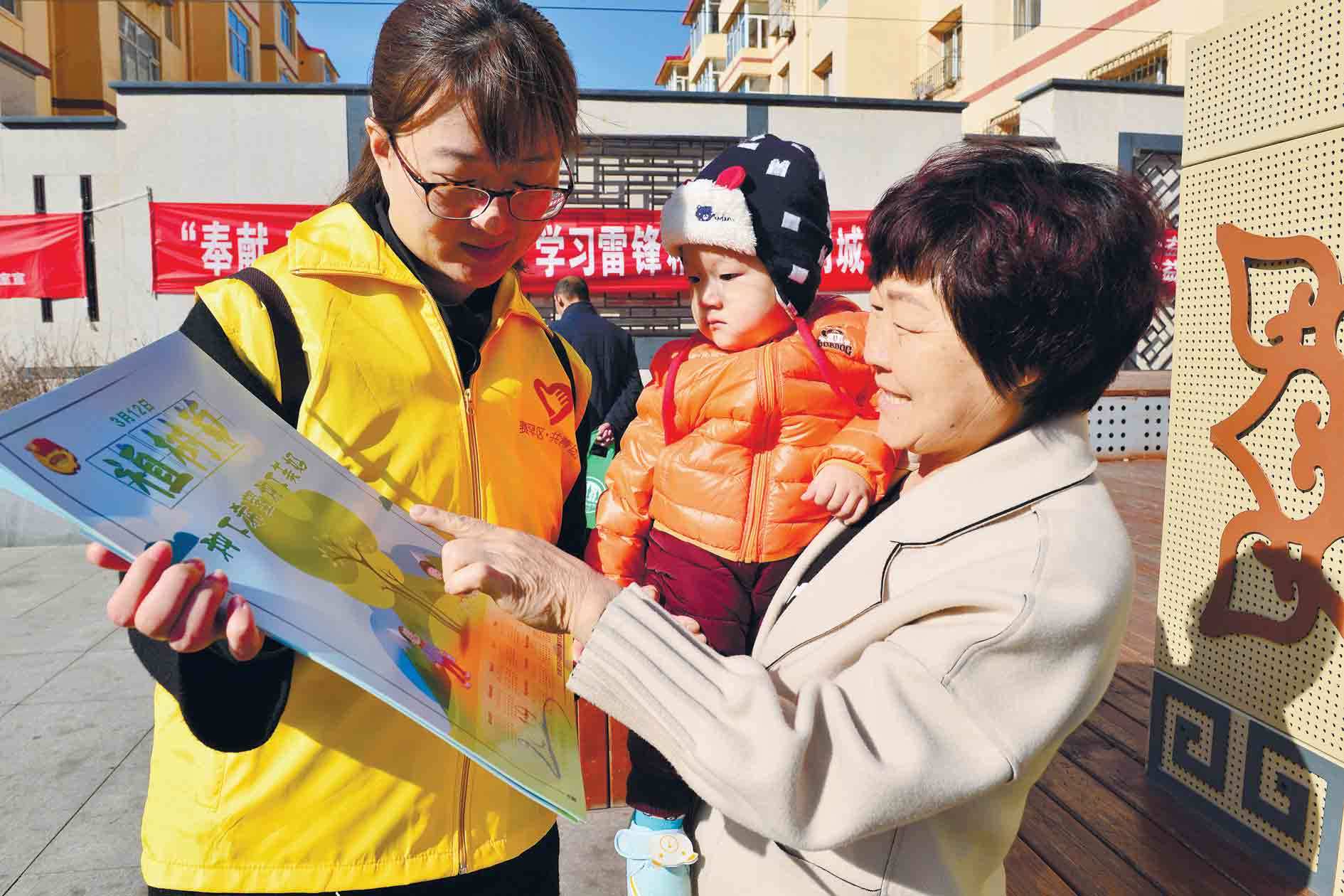 3月12日,志愿者在呼和浩特市賽罕區(qū)金地文化廣場(chǎng)上為市民發(fā)放宣傳資料。當(dāng)日,賽罕區(qū)綠化委員會(huì)辦公室舉辦了“3·12植樹節(jié)”宣傳活動(dòng)。據(jù)悉,2018年賽罕區(qū)完成植樹958萬(wàn)株(叢),人均公園綠地面積19.1平方米,建成區(qū)綠化覆蓋率42.3%。(內(nèi)蒙古日?qǐng)?bào)社融媒體記者 安寅東)