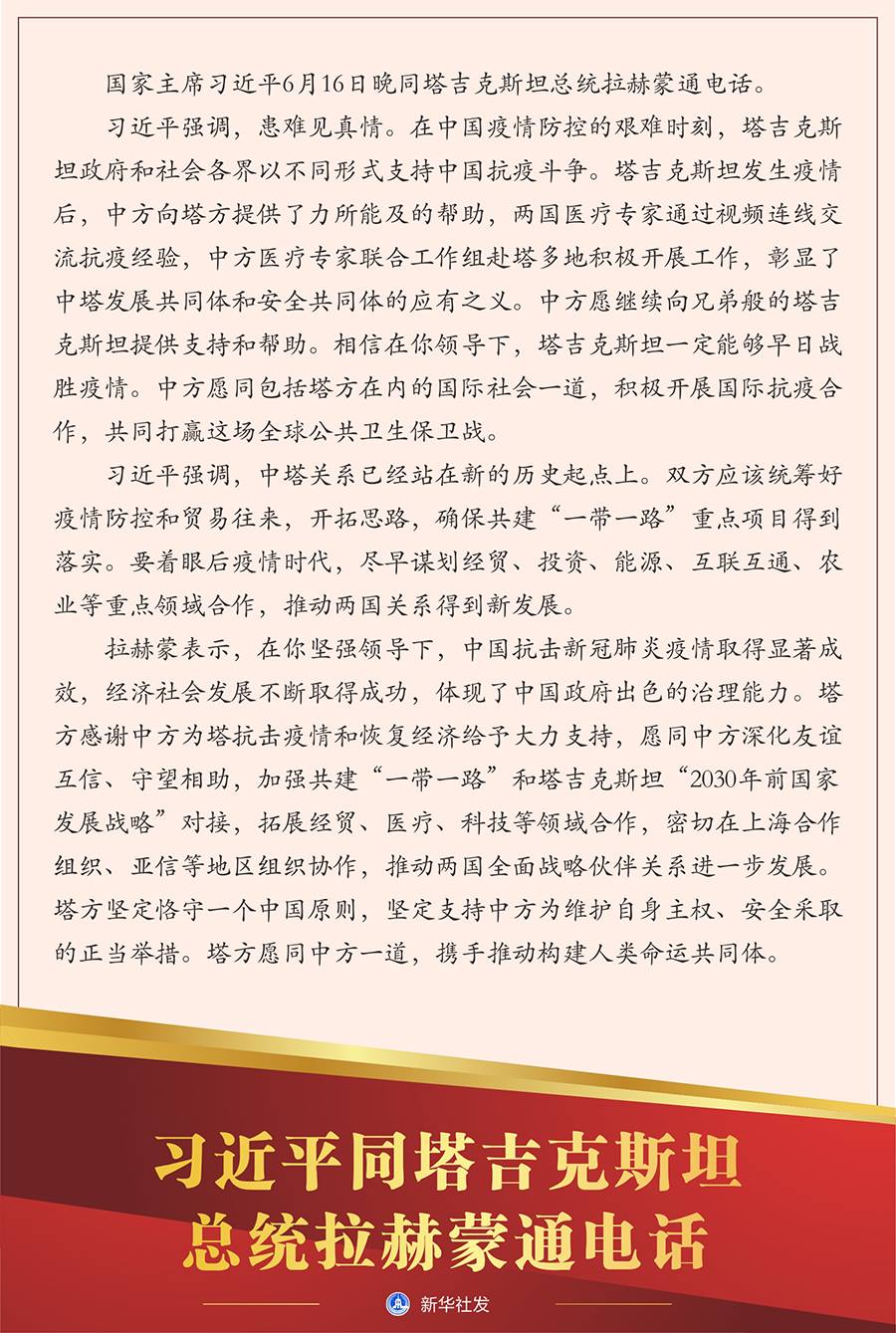 習(xí)近平強調(diào),患難見真情。在中國疫情防控的艱難時刻,塔吉克斯坦政府和社會各界以不同形式支持中國抗疫斗爭。塔吉克斯坦發(fā)生疫情后,中方向塔方提供了力所能及的幫助,兩國醫(yī)療專家通過視頻連線交流抗疫經(jīng)驗,中方醫(yī)療專家聯(lián)合工作組赴塔多地積極開展工作,彰顯了中塔發(fā)展共同體和安全共同體的應(yīng)有之義。中方愿繼續(xù)向兄弟般的塔吉克斯坦提供支持和幫助。相信在你領(lǐng)導(dǎo)下,塔吉克斯坦一定能夠早日戰(zhàn)勝疫情。中方愿同包括塔方在內(nèi)的國際社會一道,積極開展國際抗疫合作,共同打贏這場全球公共衛(wèi)生保衛(wèi)戰(zhàn)。