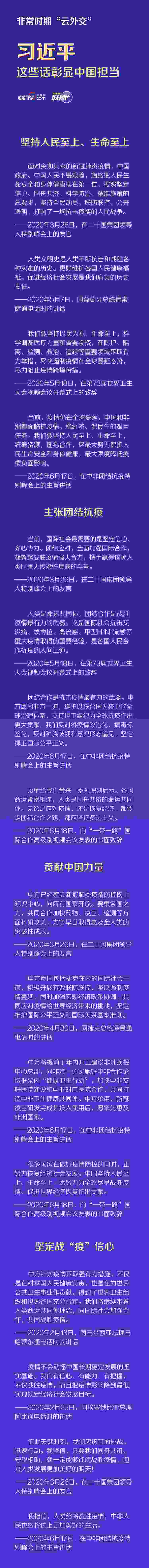截至目前,習(xí)近平主席已經(jīng)同數(shù)十位外國(guó)領(lǐng)導(dǎo)人及國(guó)際組織負(fù)責(zé)人通話或見(jiàn)面,出席二十國(guó)集團(tuán)領(lǐng)導(dǎo)人應(yīng)對(duì)新冠肺炎特別峰會(huì),在第73屆世界衛(wèi)生大會(huì)視頻會(huì)議開(kāi)幕式上致辭,主持中非團(tuán)結(jié)抗疫特別峰會(huì)并發(fā)表主旨講話等,開(kāi)啟了以電話、書(shū)信、視頻為主渠道的“云外交”模式。