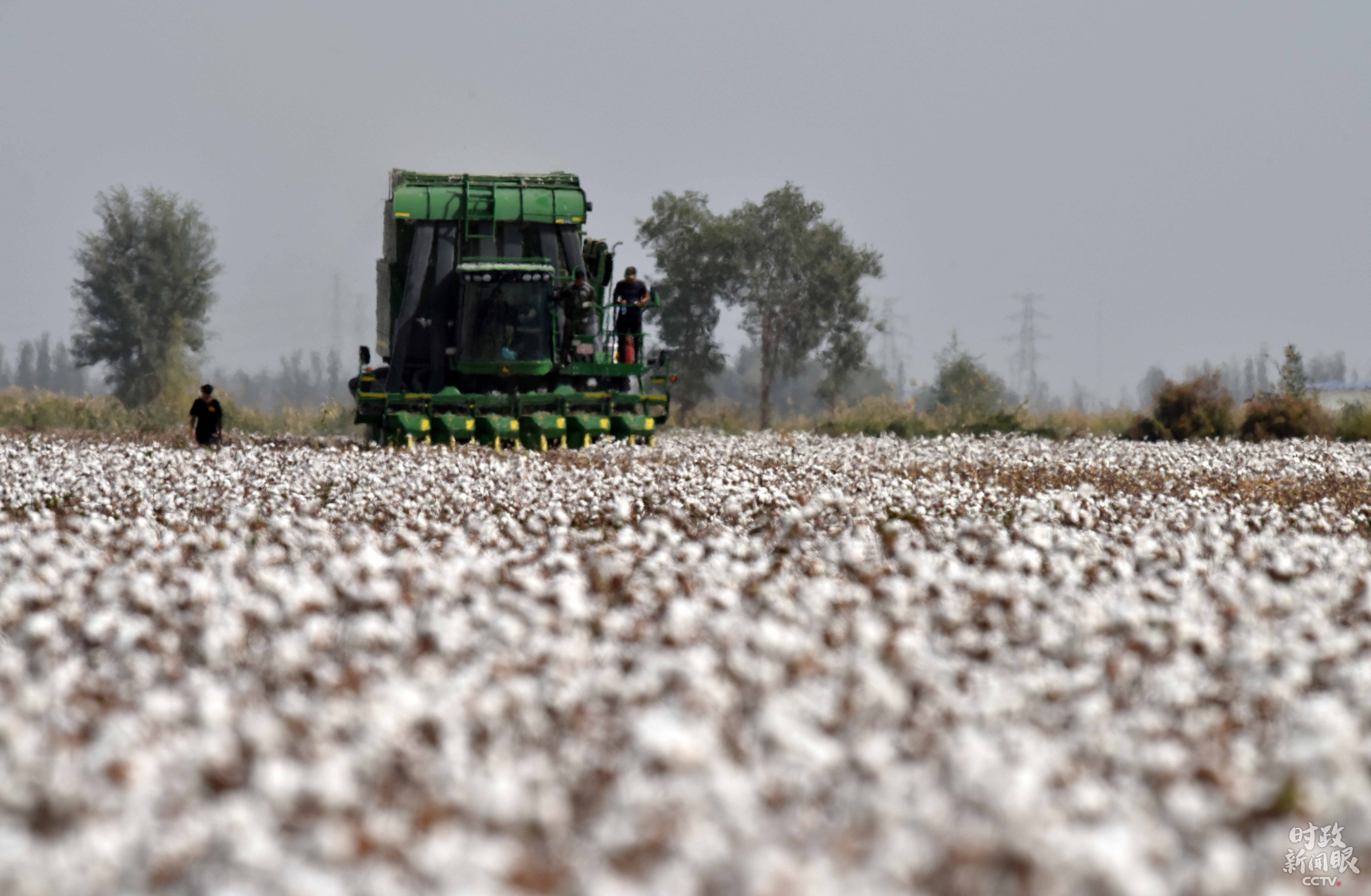 △新疆庫爾勒市普惠農(nóng)場內(nèi),大型采棉機正在采收棉花。
