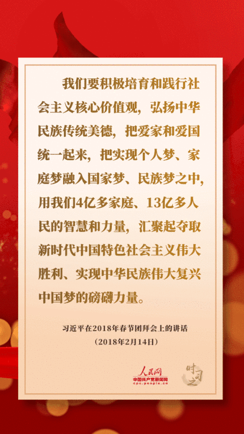 我們要積極培育和踐行社會(huì)主義核心價(jià)值觀,弘揚(yáng)中華民族傳統(tǒng)美德,把愛家和愛國(guó)統(tǒng)一起來(lái),把實(shí)現(xiàn)個(gè)人夢(mèng)、家庭夢(mèng)融入國(guó)家夢(mèng)、民族夢(mèng)之中,用我們4億多家庭、13億多人民的智慧和力量,匯聚起奪取新時(shí)代中國(guó)特色社會(huì)主義偉大勝利、實(shí)現(xiàn)中華民族偉大復(fù)興中國(guó)夢(mèng)的磅礴力量。