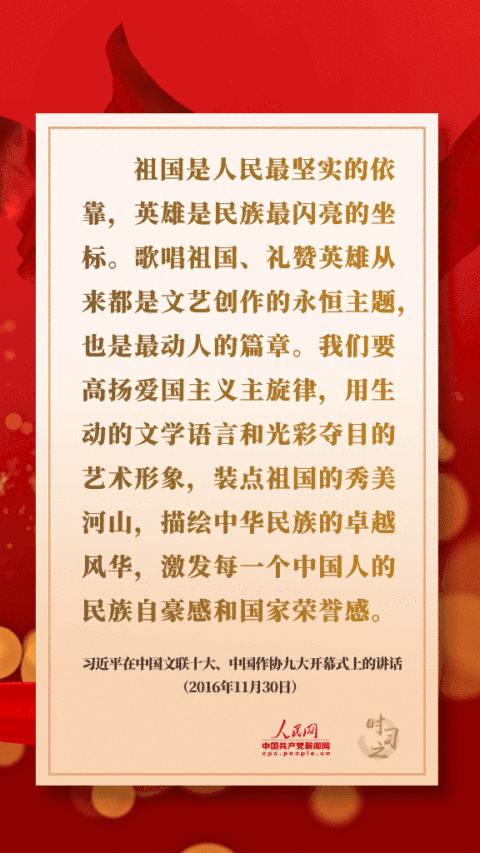 祖國(guó)是人民最堅(jiān)實(shí)的依靠,英雄是民族最閃亮的坐標(biāo)。歌唱祖國(guó)、禮贊英雄從來(lái)都是文藝創(chuàng)作的永恒主題,也是最動(dòng)人的篇章。我們要高揚(yáng)愛國(guó)主義主旋律,用生動(dòng)的文學(xué)語(yǔ)言和光彩奪目的藝術(shù)形象,裝點(diǎn)祖國(guó)的秀美河山,描繪中華民族的卓越風(fēng)華,激發(fā)每一個(gè)中國(guó)人的民族自豪感和國(guó)家榮譽(yù)感。