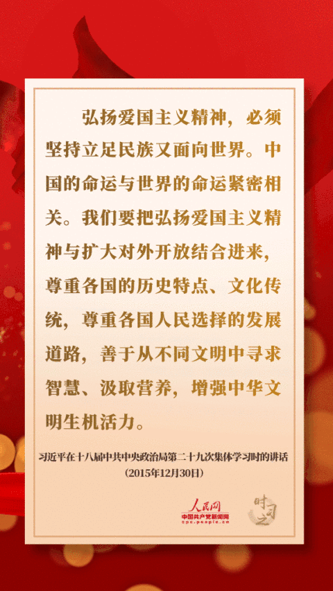 弘揚(yáng)愛國(guó)主義精神,必須堅(jiān)持立足民族又面向世界。中國(guó)的命運(yùn)與世界的命運(yùn)緊密相關(guān)。我們要把弘揚(yáng)愛國(guó)主義精神與擴(kuò)大對(duì)外開放結(jié)合進(jìn)來(lái),尊重各國(guó)的歷史特點(diǎn)、文化傳統(tǒng),尊重各國(guó)人民選擇的發(fā)展道路,善于從不同文明中尋求智慧、汲取營(yíng)養(yǎng),增強(qiáng)中華文明生機(jī)活力。