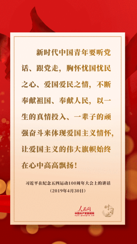 新時(shí)代中國(guó)青年要聽黨話、跟黨走,胸懷憂國(guó)憂民之心、愛國(guó)愛民之情,不斷奉獻(xiàn)祖國(guó)、奉獻(xiàn)人民,以一生的真情投入、一輩子的頑強(qiáng)奮斗來(lái)體現(xiàn)愛國(guó)主義情懷,讓愛國(guó)主義的偉大旗幟始終在心中高高飄揚(yáng)!