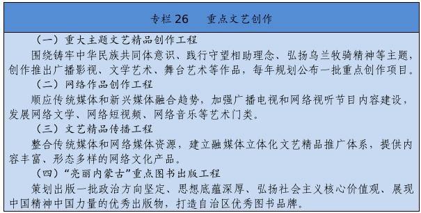 堅(jiān)持以人民為中心的創(chuàng)作導(dǎo)向,創(chuàng)作生產(chǎn)出人民喜聞樂(lè)見(jiàn)的優(yōu)秀作品。繁榮發(fā)展新聞出版、廣播影視、文學(xué)藝術(shù),實(shí)施文藝作品質(zhì)量提升工程,加強(qiáng)優(yōu)秀劇本孵化和生活采風(fēng)。推動(dòng)重大主題文藝精品創(chuàng)作,加強(qiáng)現(xiàn)實(shí)題材創(chuàng)作生產(chǎn)。改進(jìn)重點(diǎn)作品創(chuàng)作引導(dǎo)機(jī)制,建立重點(diǎn)文化藝術(shù)項(xiàng)目滾動(dòng)扶持機(jī)制。設(shè)立內(nèi)蒙古文化藝術(shù)發(fā)展專(zhuān)項(xiàng)資金。加強(qiáng)文化文藝場(chǎng)館建設(shè)。制定文藝人才發(fā)展規(guī)劃,開(kāi)展內(nèi)蒙古電影新導(dǎo)演計(jì)劃。實(shí)施文化潤(rùn)心工程,以文藝創(chuàng)作鑄牢中華民族共同體意識(shí)。提升廣播電視和網(wǎng)絡(luò)視聽(tīng)產(chǎn)品質(zhì)量,豐富網(wǎng)絡(luò)文藝內(nèi)容。搭建文藝精品遴選、展示、推出平臺(tái),建設(shè)內(nèi)蒙古音樂(lè)廳,支持因地制宜建設(shè)綜合劇場(chǎng)、音樂(lè)廳和美術(shù)館,舉辦內(nèi)蒙古藝術(shù)節(jié)、內(nèi)蒙古音樂(lè)節(jié)等活動(dòng),大力實(shí)施文藝惠民演出和地方戲傳承創(chuàng)新工程,定期舉辦全區(qū)地方戲優(yōu)秀劇目展演以及音樂(lè)、舞蹈、小戲小品專(zhuān)業(yè)賽事,打造獨(dú)具特色的文化藝術(shù)品牌。