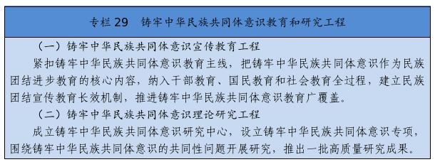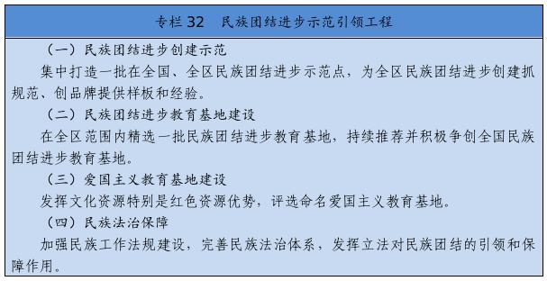 在全社會(huì)樹(shù)立和突出各民族共享的具有鮮明中華文化特征的文化符號(hào)和中華民族視覺(jué)形象,打造中國(guó)標(biāo)志。堅(jiān)定不移推廣普及國(guó)家通用語(yǔ)言文字,全面加強(qiáng)國(guó)家通用語(yǔ)言文字教育教學(xué),積極穩(wěn)妥推行國(guó)家統(tǒng)編教材使用,深化雙語(yǔ)教學(xué)模式改革,確保少數(shù)民族學(xué)生掌握和使用國(guó)家通用語(yǔ)言文字。尊重、支持各少數(shù)民族語(yǔ)言文字的學(xué)習(xí)和使用。堅(jiān)持以社會(huì)主義先進(jìn)文化為引領(lǐng),促進(jìn)各民族文化交融、創(chuàng)新。提倡文明現(xiàn)代的生活方式,引導(dǎo)和幫助各族群眾追求現(xiàn)代文明生活,推進(jìn)民族進(jìn)步。強(qiáng)化全體公民日常行為規(guī)范,完善市民公約、鄉(xiāng)規(guī)民約、學(xué)生守則、行業(yè)規(guī)章、職業(yè)規(guī)則、團(tuán)體章程,營(yíng)造自覺(jué)遵法守法、尊重少數(shù)民族風(fēng)俗習(xí)慣和宗教信仰、維護(hù)民族團(tuán)結(jié)的社會(huì)氛圍。著力開(kāi)展興邊富民行動(dòng),打牢守邊固邊的民族團(tuán)結(jié)基礎(chǔ)。