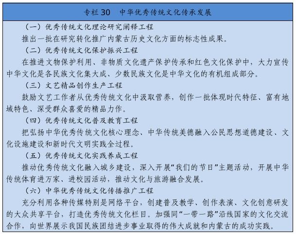 實(shí)施文化遺產(chǎn)系統(tǒng)性保護(hù)工程,強(qiáng)化重要文化和自然遺產(chǎn)、非物質(zhì)文化遺產(chǎn)系統(tǒng)性保護(hù),建立整體保護(hù)、活態(tài)傳承、創(chuàng)新發(fā)展體系。實(shí)施重大文物保護(hù)工程,推進(jìn)長(zhǎng)城、黃河國(guó)家文化公園和大窯、遼上京、和林格爾土城子等國(guó)家考古遺址公園建設(shè)。推動(dòng)萬(wàn)里茶道(內(nèi)蒙古段)、遼上京和祖陵遺址、紅山遺址群和陰山巖刻申遺。加強(qiáng)阿爾寨石窟寺等石窟文物保護(hù)。開(kāi)展“中華文明探源”工程、“考古中國(guó)”河套地區(qū)早期聚落遺址考古發(fā)掘研究。建設(shè)內(nèi)蒙古非遺博覽園、內(nèi)蒙古黃河文化博物館、內(nèi)蒙古工業(yè)博物館。加強(qiáng)紀(jì)念館、展覽館、博物館建設(shè)管理。推進(jìn)民族優(yōu)秀傳統(tǒng)手工藝保護(hù)傳承和振興,完善非遺名錄體系。實(shí)施中華傳統(tǒng)節(jié)日振興工程,開(kāi)展傳統(tǒng)節(jié)日禮儀禮節(jié)教育活動(dòng)。
