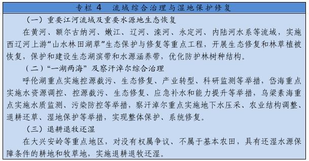 大力推進(jìn)黃河生態(tài)帶建設(shè),統(tǒng)籌水環(huán)境、水生態(tài)、水資源、水安全、水文化,推進(jìn)干支流一體化治理,突出抓好十大孔兌、多沙粗砂區(qū)集中來(lái)源區(qū)等水土保持治理,實(shí)施河道和灘區(qū)綜合提升治理工程,完善水沙調(diào)控機(jī)制。深化“一湖兩?!奔安旌鼓谞柹鷳B(tài)環(huán)境綜合治理,創(chuàng)新區(qū)域系統(tǒng)治理和流域整體治理舉措,逐步改善生態(tài)環(huán)境。全面加強(qiáng)嫩江、遼河、內(nèi)陸河水系等流域和達(dá)里諾爾、烏拉蓋等濕地生態(tài)保護(hù)修復(fù),深入開(kāi)展地下水超采綜合治理。