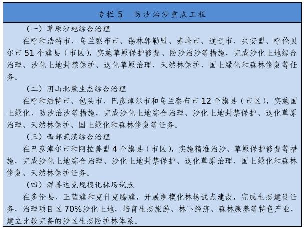 繼續(xù)實(shí)施京津風(fēng)沙源治理等重點(diǎn)工程,推廣庫(kù)布其沙漠治理方式和沙產(chǎn)業(yè)模式,推動(dòng)渾善達(dá)克、烏珠穆沁、呼倫貝爾沙地治理。推進(jìn)規(guī)模化林場(chǎng)建設(shè),采取人工造林、封沙育林、飛播造林等方式恢復(fù)植被。建設(shè)荒漠綠洲防護(hù)林、防風(fēng)固沙林、沙漠鎖邊林、農(nóng)田草牧場(chǎng)防護(hù)林以及水土保持林。以干旱半干旱草原為重點(diǎn),加強(qiáng)草場(chǎng)改良和人工種草,實(shí)行圍封禁牧、劃區(qū)輪牧、季節(jié)性休牧、舍飼圈養(yǎng)等措施,保護(hù)和恢復(fù)草原植被。以?xún)?nèi)蒙古高原等為重點(diǎn),推進(jìn)防護(hù)林體系建設(shè)及退化林修復(fù)、退化草原修復(fù)、京津風(fēng)沙源治理。新增水土流失綜合治理3.33萬(wàn)平方公里。
