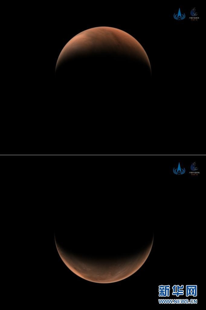 2021年3月26日,國家航天局發(fā)布2幅由我國首次火星探測任務(wù)天問一號(hào)探測器拍攝的南、北半球火星側(cè)身影像。這是一張拼版照片,上圖為:北半球上方火星影像;下圖為:南半球上方火星影像?! ?/p>
