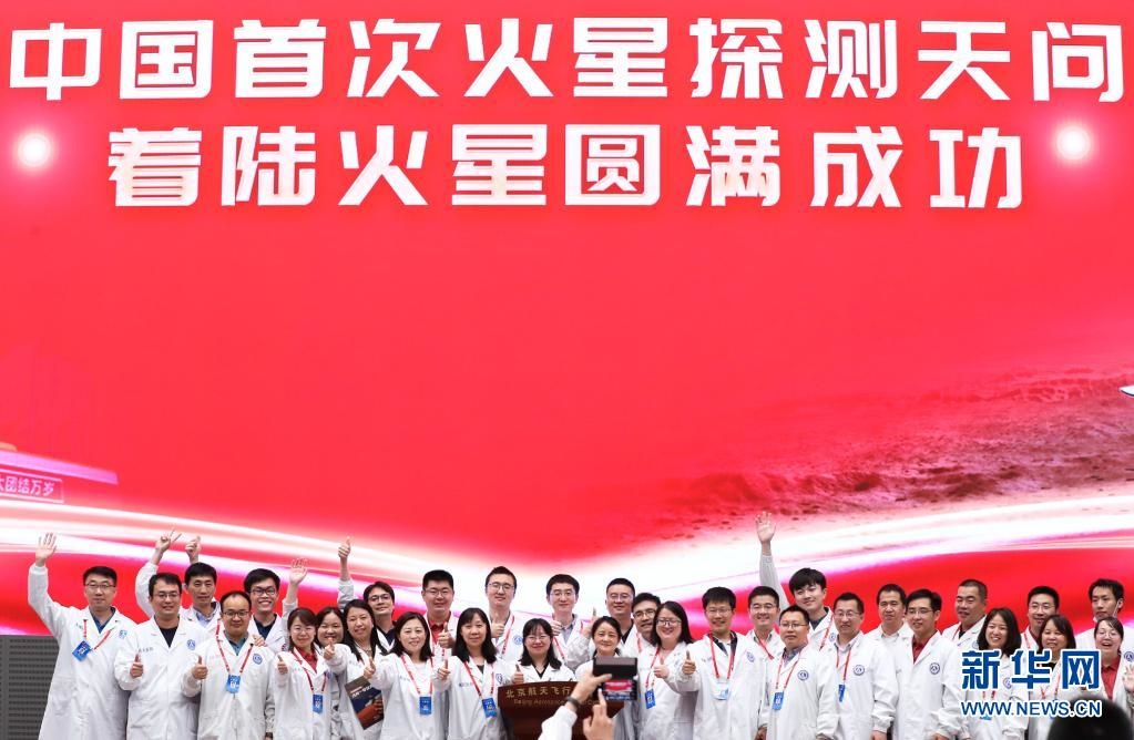 2021年5月15日,航天科研人員在北京航天飛行控制中心指揮大廳慶祝我國首次火星探測任務(wù)著陸火星成功。新華社記者 金立旺 攝