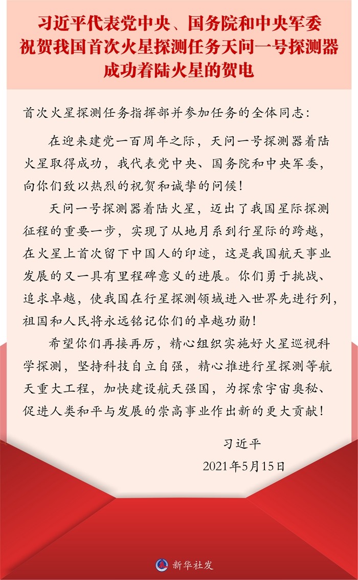 7時(shí)18分,天問一號探測器成功著陸于火星烏托邦平原南部預(yù)選著陸區(qū),我國首次火星探測任務(wù)著陸火星取得成功。習(xí)近平總書記第一時(shí)間發(fā)來賀電,為首次火星探測任務(wù)指揮部并參加任務(wù)的全體同志點(diǎn)贊。