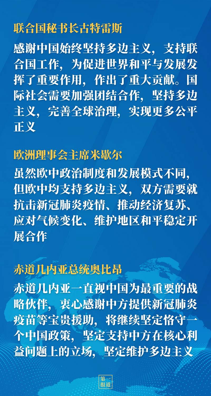 在同聯(lián)合國(guó)秘書(shū)長(zhǎng)古特雷斯、歐洲理事會(huì)主席米歇爾、巴基斯坦總理伊姆蘭·汗、巴布亞新幾內(nèi)亞總理馬拉佩、赤道幾內(nèi)亞總統(tǒng)奧比昂等國(guó)際和地區(qū)組織以及國(guó)家領(lǐng)導(dǎo)人的交流中,習(xí)近平主席都分別同各方就堅(jiān)持真正的多邊主義深入交流,獲得積極反饋——