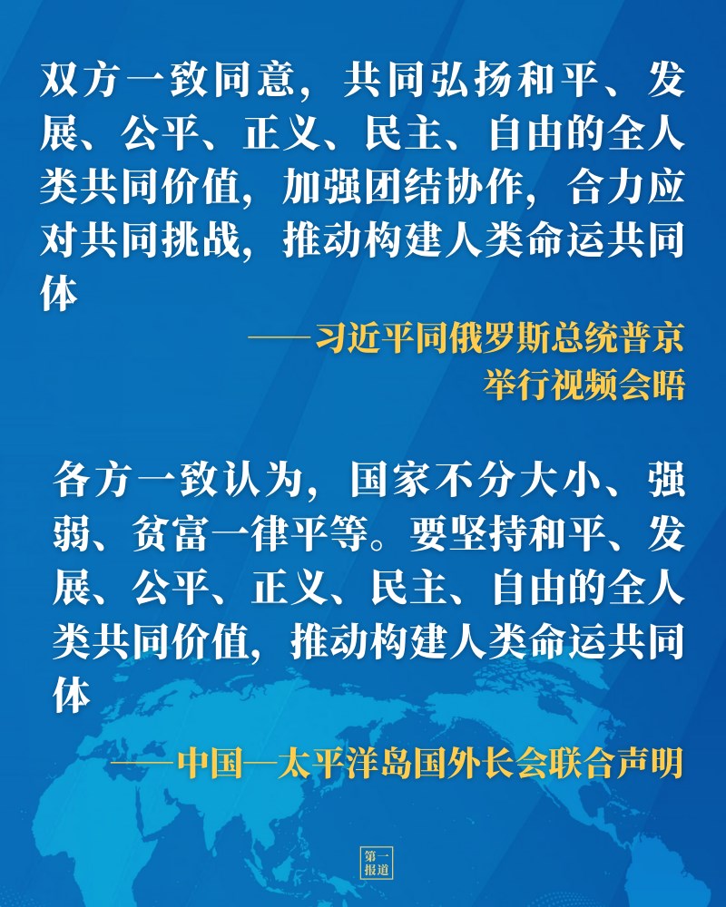 從同普京總統(tǒng)視頻會(huì)晤、同菲律賓總統(tǒng)杜特爾特通電話,到第七十屆聯(lián)合國(guó)大會(huì)一般性辯論、世界經(jīng)濟(jì)論壇“達(dá)沃斯議程”對(duì)話會(huì)、中國(guó)共產(chǎn)黨與世界政黨領(lǐng)導(dǎo)人峰會(huì)等多邊場(chǎng)合,習(xí)近平主席多次闡述全人類(lèi)共同價(jià)值的深刻內(nèi)涵,凝聚中外共識(shí)。