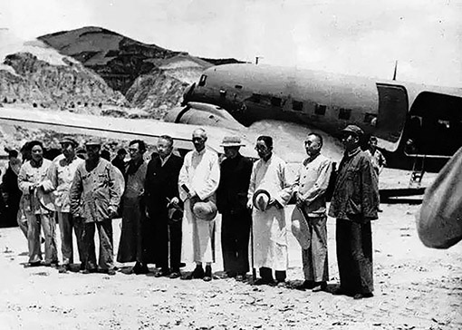 1945年7月,國民參政會參政員黃炎培等六人飛抵延安,同中國共產(chǎn)黨商談兩黨團結(jié)、共建國內(nèi)和平問題,毛澤東等親臨機場歡迎。圖:新華社
