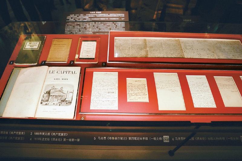 中國共產黨歷史展覽館的展廳里,陳列著多份珍貴的馬克思手稿。右上為馬克思《布魯塞爾筆記》第四筆記本手稿;右下為馬克思寫給《資本論》法文版出版人的六封書信。 中新社發(fā) 陳曉根/攝