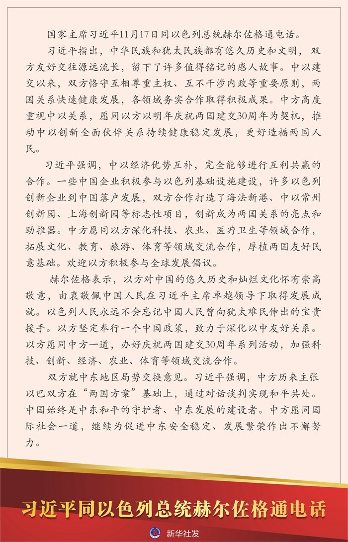 新華社北京11月17日電國家主席習近平11月17日同以色列總統(tǒng)赫爾佐格通電話。