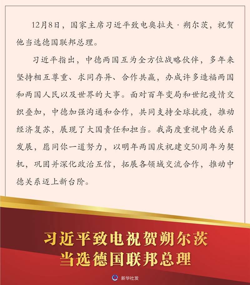 新華社北京12月8日電 12月8日,國家主席習(xí)近平致電奧拉夫·朔爾茨,祝賀他當(dāng)選德國聯(lián)邦總理。