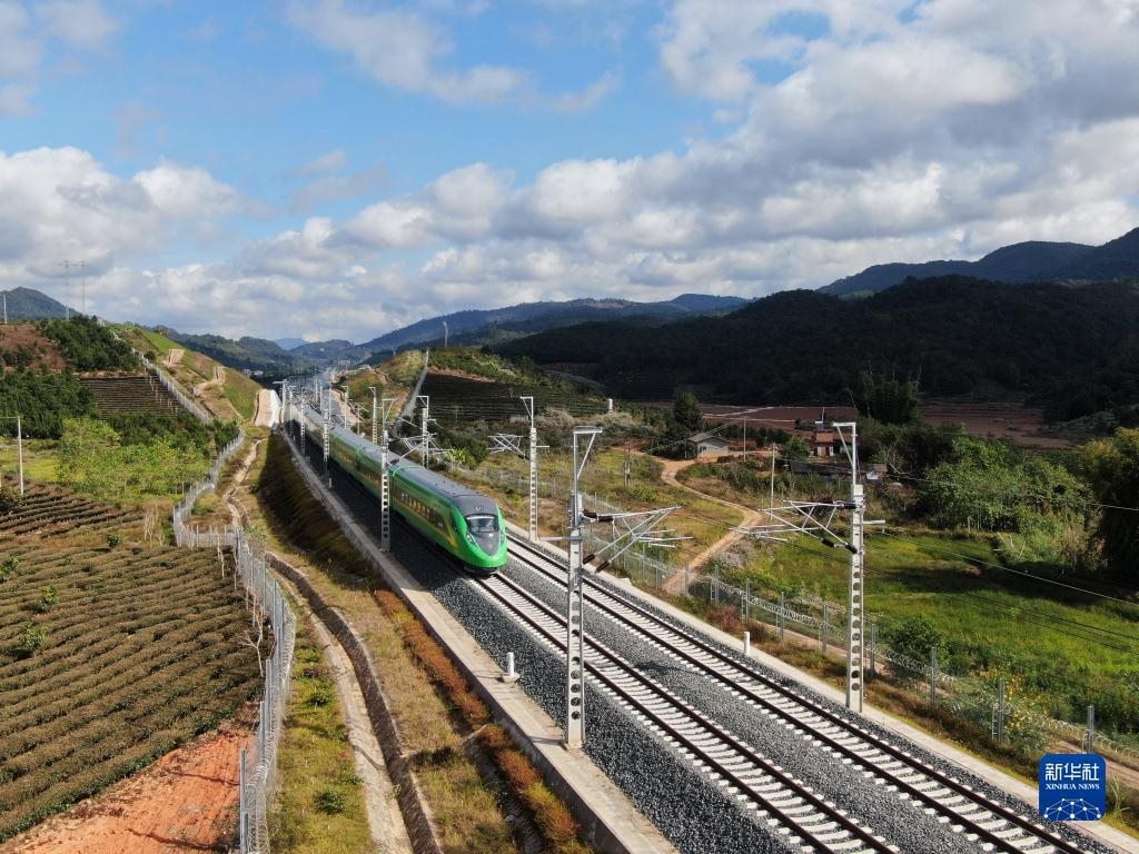2022年1月3日,列車行駛在位于云南西雙版納傣族自治州景洪市境內的中老鐵路上(無人機照片)。新華社發(fā)(李云生攝)