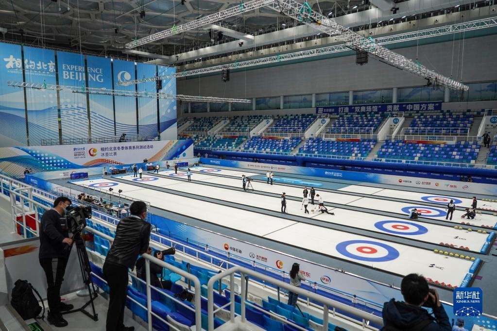 2021年4月6日,運動員在冰壺項目測試活動中。2022年北京冬奧會將國家游泳中心“水立方”改造為“冰立方”,用作冰壺項目比賽場館,有效減少建設投資,更讓夏奧場館煥然新生,拓展多元賽后經(jīng)營能力。新華社記者彭子洋攝