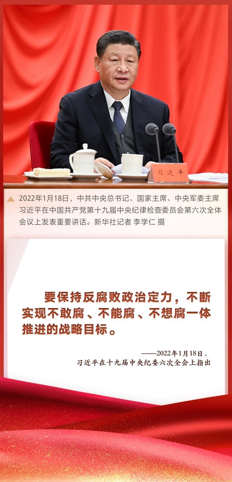 “要保持反腐敗政治定力,不斷實(shí)現(xiàn)不敢腐、不能腐、不想腐一體推進(jìn)的戰(zhàn)略目標(biāo)。”中共中央總書記、國家主席、中央軍委主席習(xí)近平在十九屆中央紀(jì)委六次全會(huì)上發(fā)表重要講話,深刻總結(jié)新時(shí)代黨的自我革命的成功實(shí)踐,深刻闡述全面從嚴(yán)治黨取得的歷史性、開創(chuàng)性成就,產(chǎn)生的全方位、深層次影響,對(duì)堅(jiān)持不懈把全面從嚴(yán)治黨向縱深推進(jìn)、迎接黨的二十大勝利召開作出戰(zhàn)略部署。