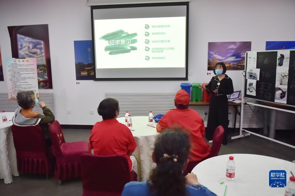 在北京建國門街道趙家樓社區(qū)議事廳舉行的“兩桶一袋”居民征求意見懇談會上,來自社區(qū)的12位垃圾分類達(dá)人對“兩桶”款式進(jìn)行投票選擇,同時,街道針對桶站位置、定時定點投放等垃圾分類運營管理聽取居民意見(2020年5月2日攝)。新華社記者彭子洋攝