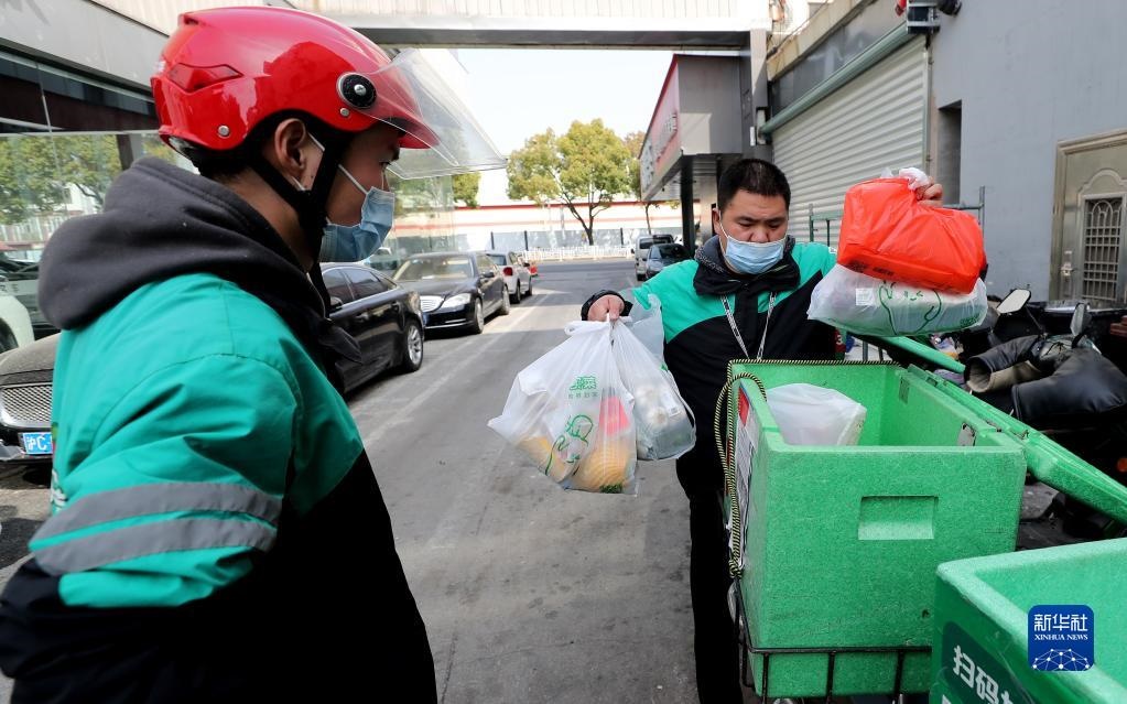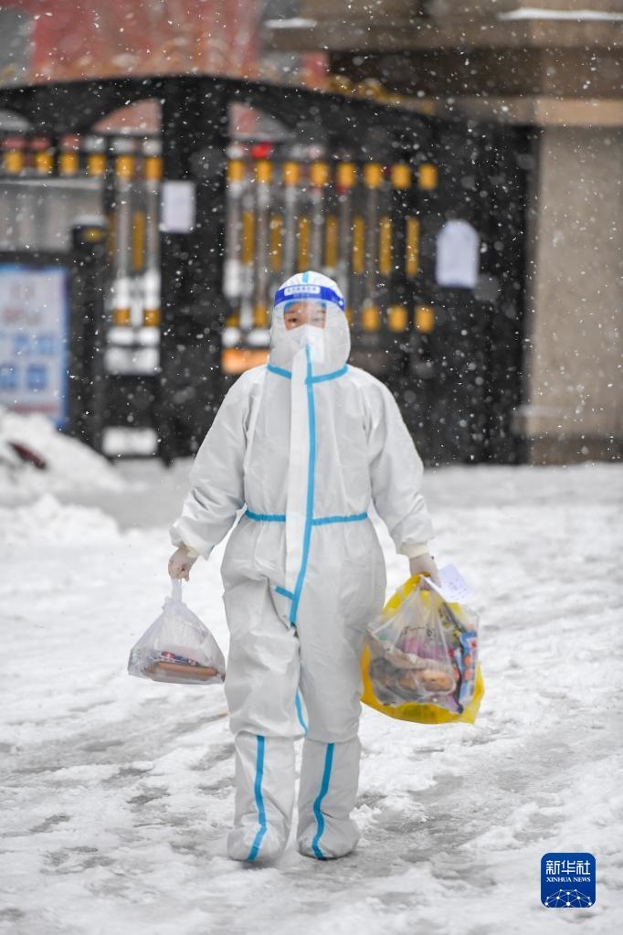 3月15日,吉林省吉林市昌邑區(qū)興華街道中興社區(qū)網(wǎng)格員宋冉為隔離居民運(yùn)送生活物資。新華社記者 張楠 攝
