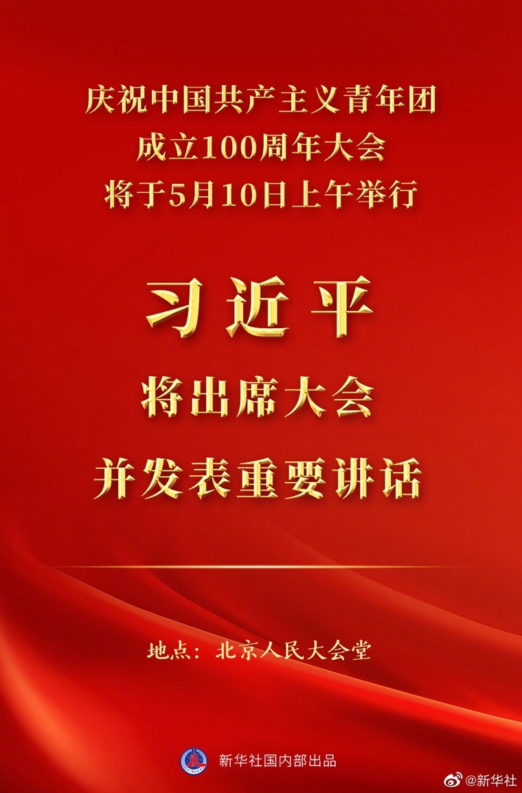 新華社北京5月8日電慶祝中國共產(chǎn)主義青年團(tuán)成立100周年大會將于5月10日上午在北京人民大會堂隆重舉行。中共中央總書記、國家主席、中央軍委主席習(xí)近平將出席大會并發(fā)表重要講話。