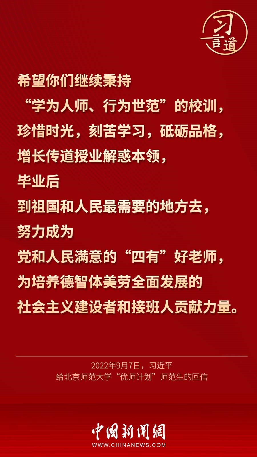 9月7日,習(xí)近平總書記回信勉勵北京師范大學(xué)“優(yōu)師計(jì)劃”師范生,努力成為黨和人民滿意的“四有”好老師。十八大以來,習(xí)近平多次通過書信的形式,對教師群體寄予殷切期望。