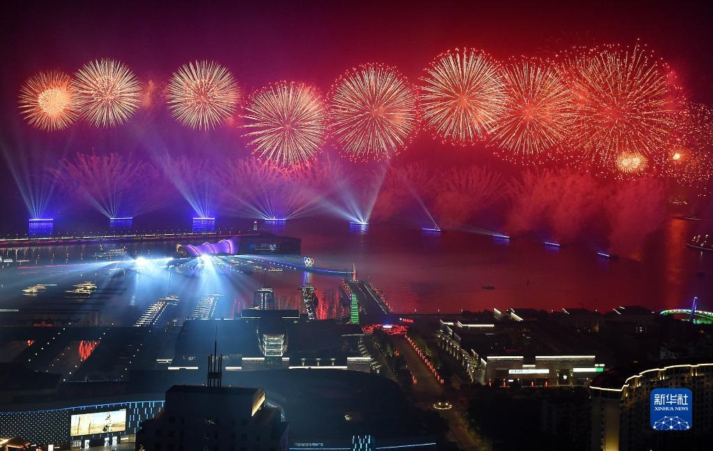 這是2018年6月9日晚在青島舉行的《有朋自遠(yuǎn)方來(lái)》燈光焰火藝術(shù)表演。2018年6月9日至10日,上海合作組織成員國(guó)元首理事會(huì)第十八次會(huì)議在青島召開(kāi)。新華社記者 李紫恒 攝