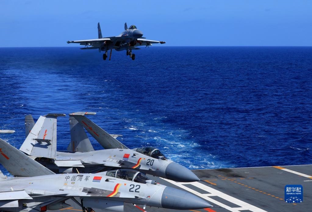 海軍遼寧艦編隊遠海實戰(zhàn)化訓(xùn)練期間,殲-15艦載戰(zhàn)斗機準(zhǔn)備著艦(資料照片)。新華社發(fā)(胡善敏攝)