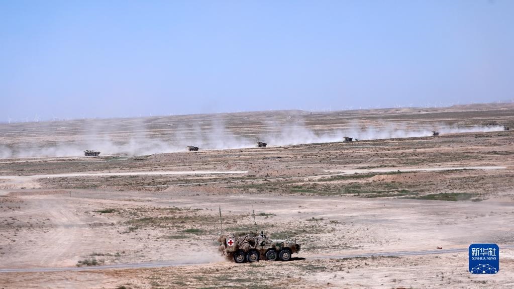 在“西部·聯(lián)合-2021”演習(xí)第一次實兵實裝實彈合練中,野戰(zhàn)救護力量為聯(lián)合任務(wù)部隊提供保障(2021年8月5日攝)。新華社記者劉芳攝