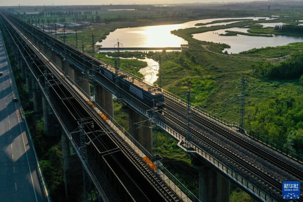 重載列車(chē)行駛在大秦鐵路上(2022年7月16日攝,無(wú)人機(jī)照片)。為做好迎峰度夏能源保供工作,中國(guó)鐵路太原局集團(tuán)有限公司在確保運(yùn)輸安全的前提下全力提升煤炭運(yùn)量。新華社記者曹陽(yáng)攝