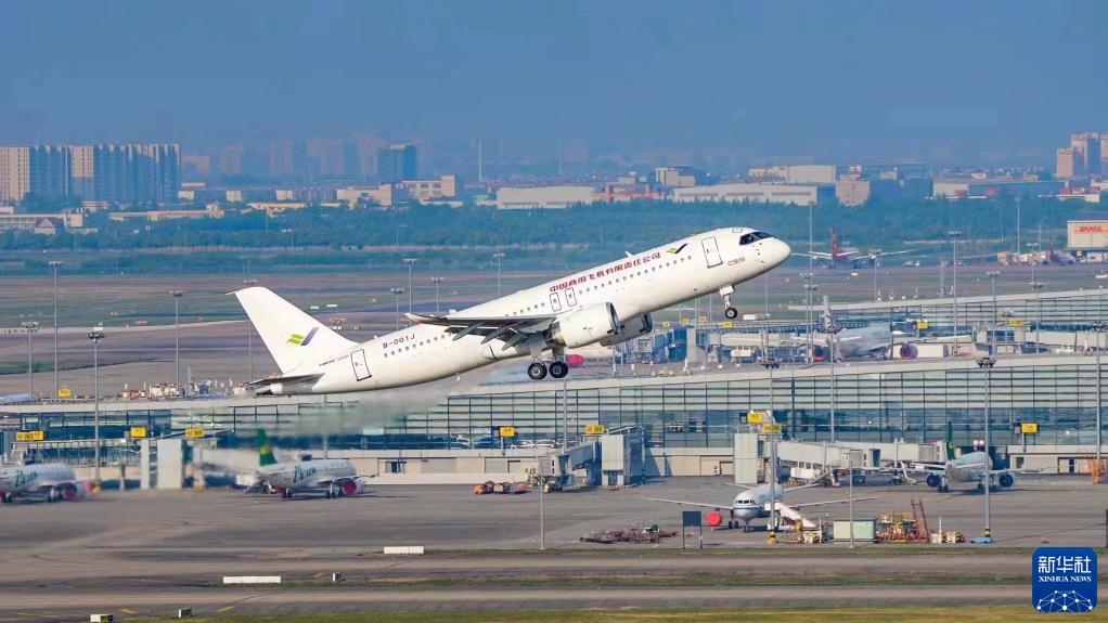 2022年5月14日6時(shí)52分,編號(hào)為B-001J的C919大飛機(jī)從上海浦東機(jī)場(chǎng)第4跑道起飛,于9時(shí)54分安全降落,標(biāo)志著中國(guó)商飛公司即將交付首家用戶的首架C919大飛機(jī)首次飛行試驗(yàn)圓滿完成。新華社發(fā)