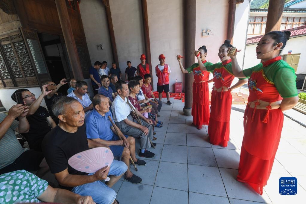 浙江省杭州市臨安區(qū)高虹鎮(zhèn)廉政文藝宣傳隊(duì)在石門村表演快板小段《清廉高虹》(2021年9月1日攝)。新華社記者 徐昱 攝