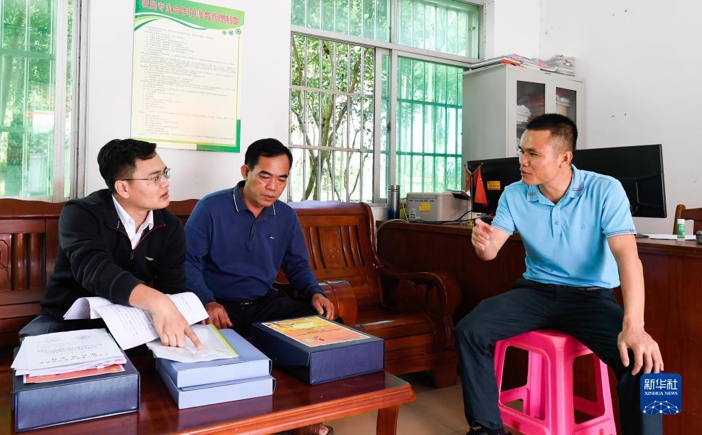 在海南省瓊中黎族苗族自治縣灣嶺鎮(zhèn)加章村委會(huì),紀(jì)檢監(jiān)察干部(左一)在查閱鄉(xiāng)村振興及村級(jí)財(cái)務(wù)支出相關(guān)材料(2021年11月13日攝)。新華社記者 楊冠宇 攝