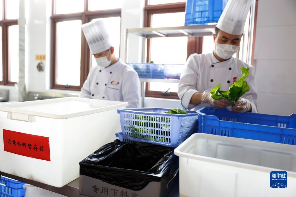 在某中央國(guó)家機(jī)關(guān)食堂,廚師將菜根等邊角余料放入暫存箱(2020年10月26日攝)。新華社記者 劉彬 攝