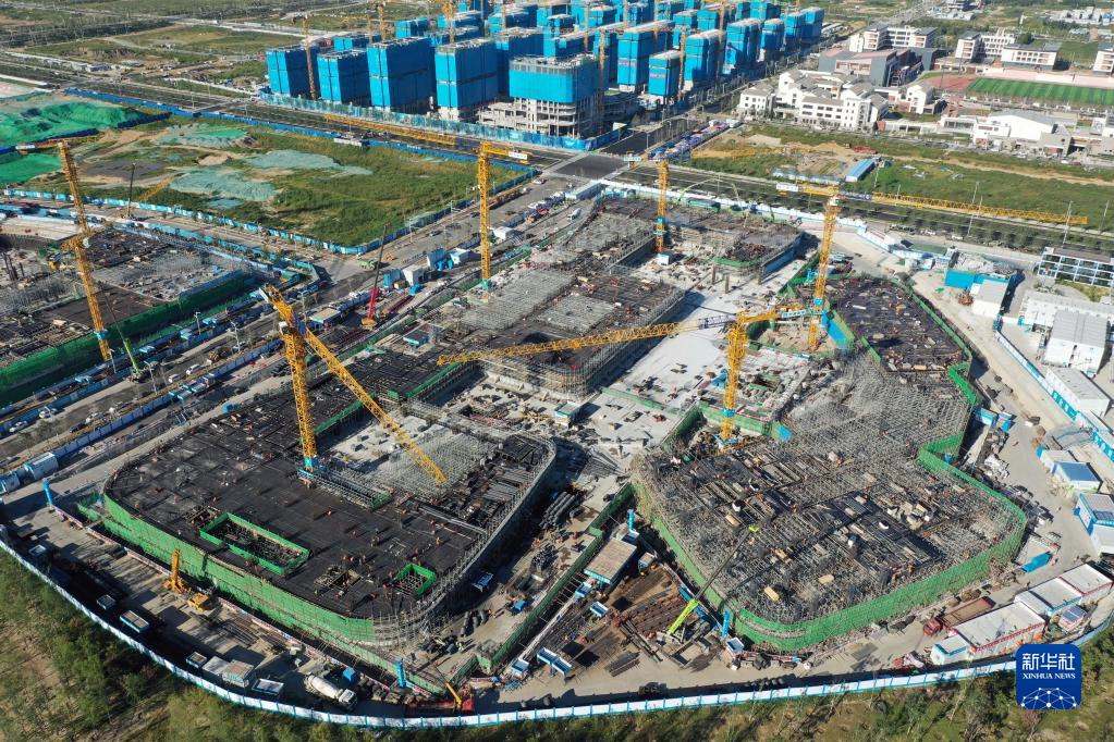位于雄安新區(qū)啟動區(qū)的中國星網(wǎng)雄安新區(qū)總部大樓建設(shè)施工現(xiàn)場(2022年9月7日攝,無人機照片)。新華社記者 朱旭東 攝