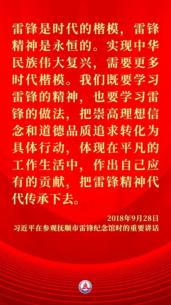 “雷鋒是時(shí)代的楷模,雷鋒精神是永恒的。實(shí)現(xiàn)中華民族偉大復(fù)興,需要更多時(shí)代楷模?!绷?xí)近平總書記的號召,喚起億萬人奮斗與堅(jiān)守。新時(shí)代,雷鋒精神是持續(xù)激發(fā)崇德向善的磅礴偉力;新時(shí)代“雷鋒”,在新征程上頑強(qiáng)拼搏,匯聚起共和國奔騰向前的時(shí)代潮流!