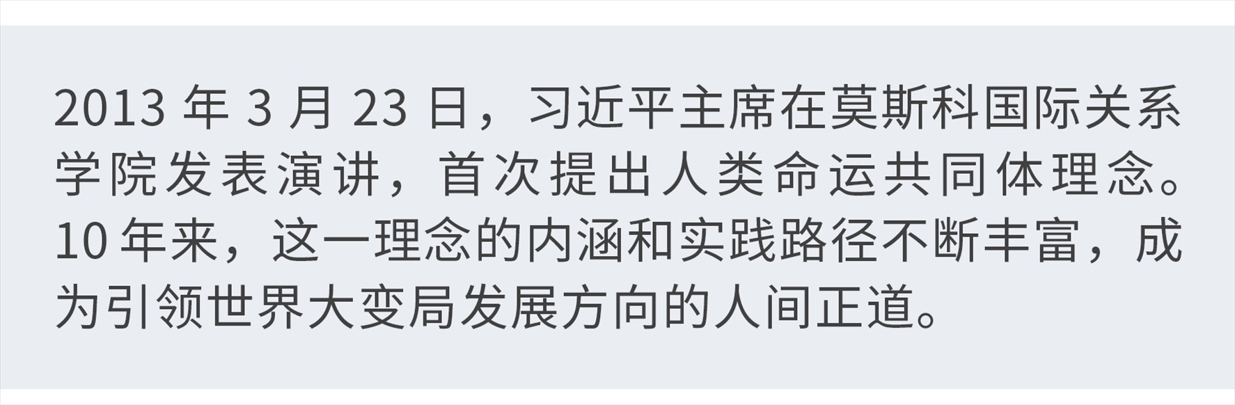 10年前,也是在早春時(shí)節(jié),習(xí)近平主席在莫斯科國際關(guān)系學(xué)院發(fā)表演講,首次提出人類命運(yùn)共同體理念——“這個(gè)世界,各國相互聯(lián)系、相互依存的程度空前加深,人類生活在同一個(gè)地球村里,生活在歷史和現(xiàn)實(shí)交匯的同一個(gè)時(shí)空里,越來越成為你中有我、我中有你的命運(yùn)共同體?!?/p>