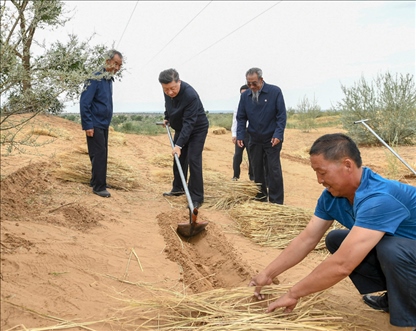 △2019年8月21日,正在甘肅考察的習(xí)近平總書(shū)記來(lái)到古浪縣八步沙林場(chǎng)??疾熘?,他拿起一把開(kāi)溝犁,參與到治沙勞動(dòng)中。