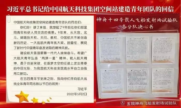 2022年5月2日,習近平總書記給中國航天科技集團空間站建造青年團隊回信,高度肯定航天青年,殷切期待青春奮斗。他強調:“希望廣大航天青年弘揚‘兩彈一星’精神、載人航天精神,勇于創(chuàng)新突破,在逐夢太空的征途上發(fā)出青春的奪目光彩,為我國航天科技實現(xiàn)高水平自立自強再立新功?!币荒陙?,五院人持續(xù)學習重溫、堅決貫徹落實習近平總書記重要回信精神和關于航天強國建設的重要指示批示精神,始終做到牢記囑托、感恩奮進,交出非凡“答卷”。