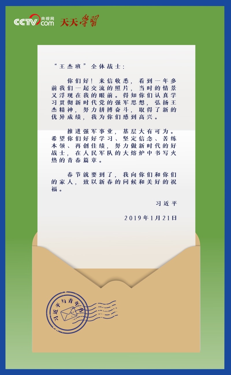 “你們好!來信收悉,看到一年多前我們一起交流的照片,當(dāng)時的情景又浮現(xiàn)在我的眼前。得知你們認(rèn)真學(xué)習(xí)貫徹新時代黨的強(qiáng)軍思想,弘揚王杰精神,努力拼搏奮斗,取得了新的優(yōu)異成績,我為你們感到高興……”